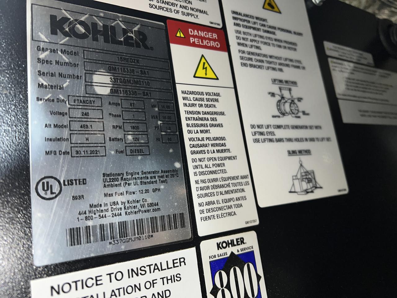 - Engine Description15 kW Kohler Diesel Gen Set, Year - 2021, 0 Hours, Sound Attenuated Enclosure and Base Fuel Tank, US EPA Tier 3 Pre Emission Engine
