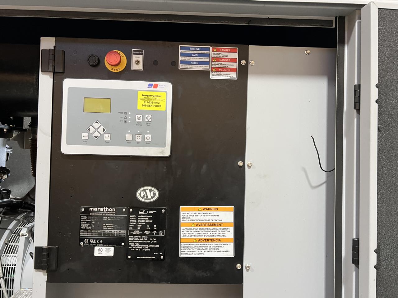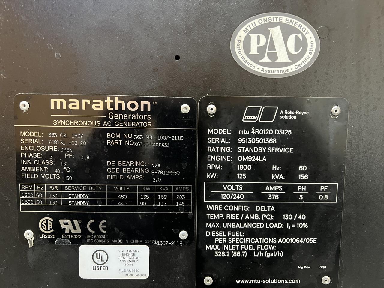 - Engine Description125 kW MTU Generator, with Sound Attenuated Enclosure and Base Fuel Tank, Mercedes-Benz Engine, Year - 2020, 31 Hours