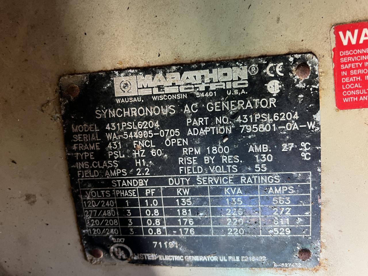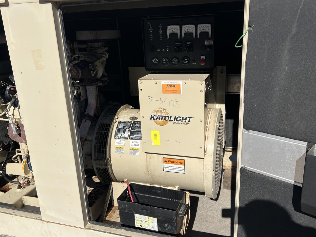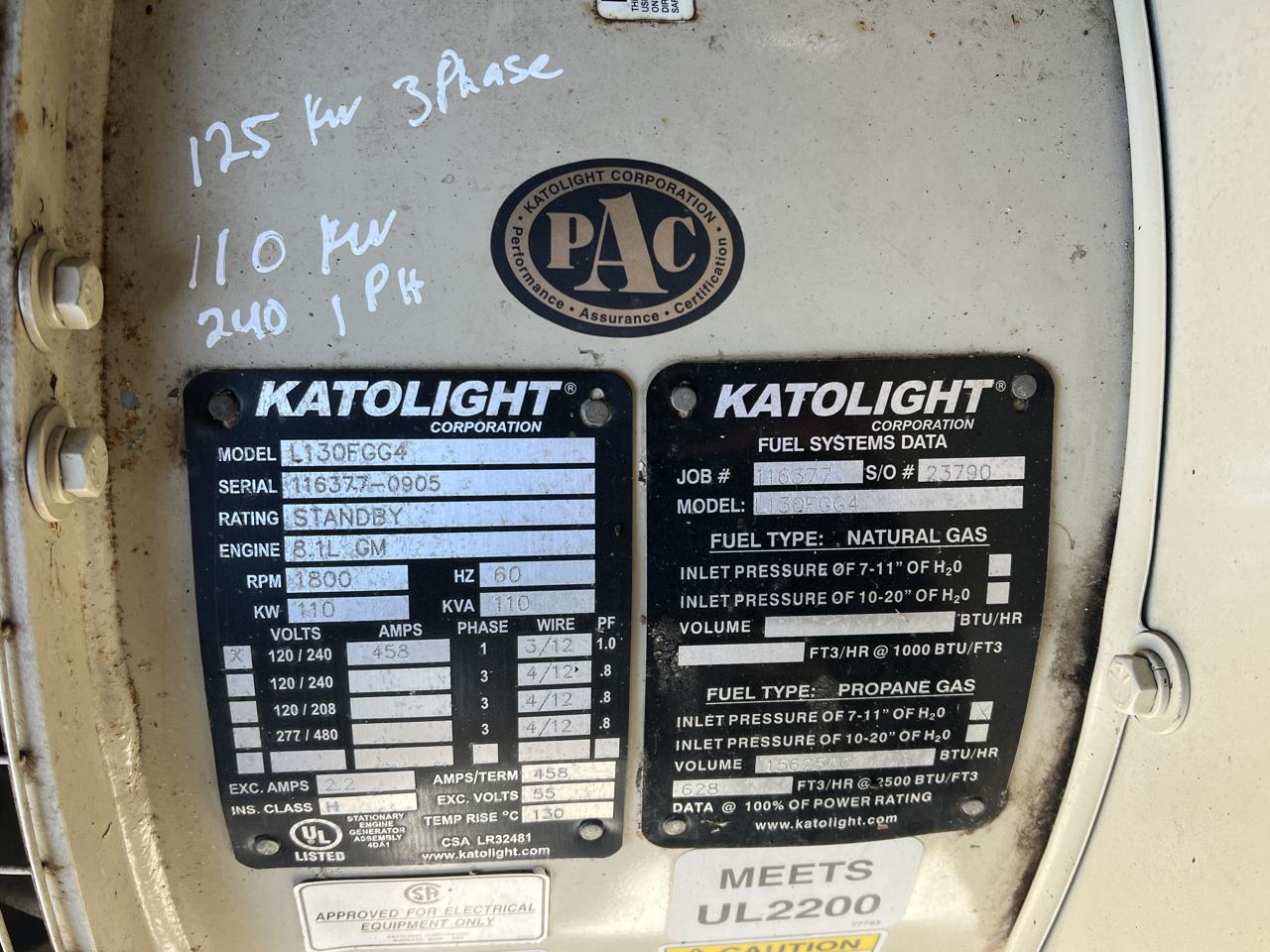 - Engine Description125 kW Katolight Generator, with Sound Attenuated Enclosure, Natural Gas or Propane, PSI 8.1 Liter GMC Engine, 1014 Hours