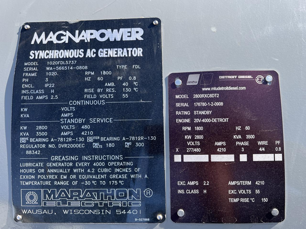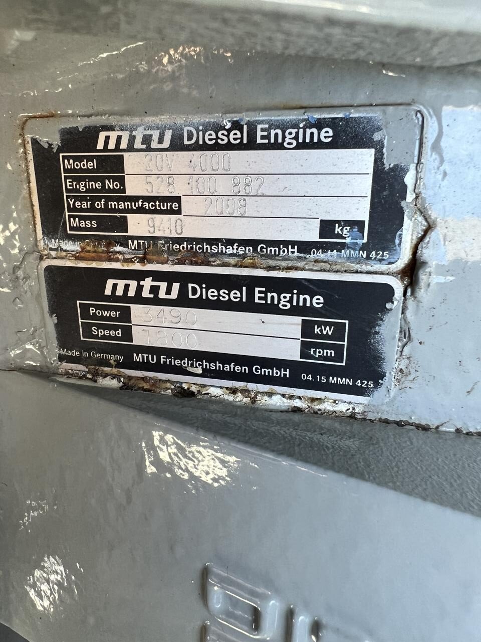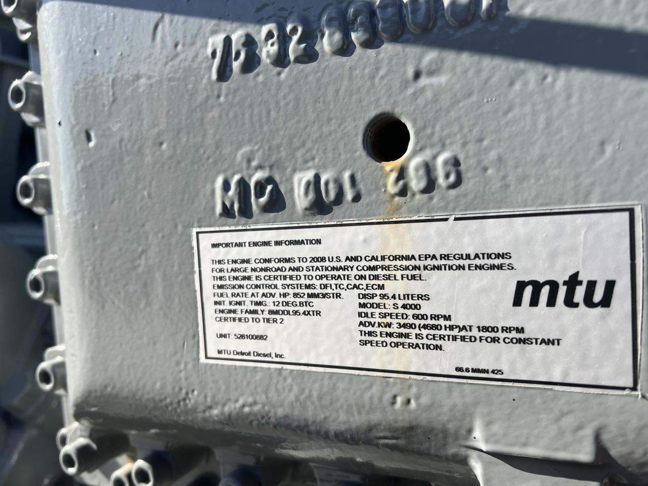 - Engine Description2800 kW MTU GenSet, 20 V 4000 Diesel Engine, Year - 2008, 406 Hours, US EPA Tier 2 Pre Emission Engine