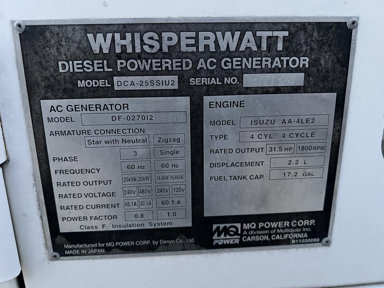 - Engine Description25 kW MQ Power Portable Rental Grade Generator, Isuzu Engine, Year - 2005, Sound Attenuated Enclosure, with Voltage Selector Switch
