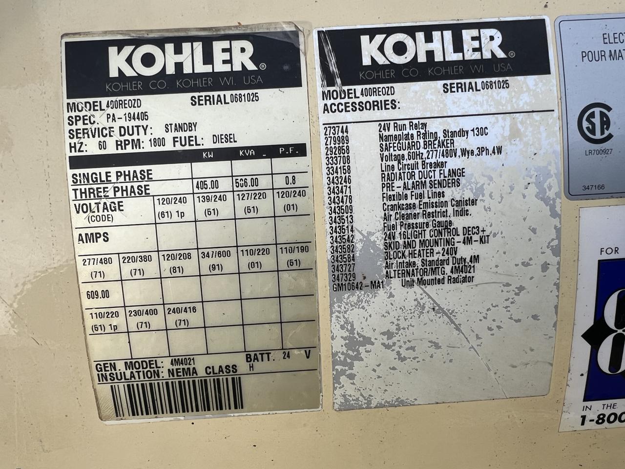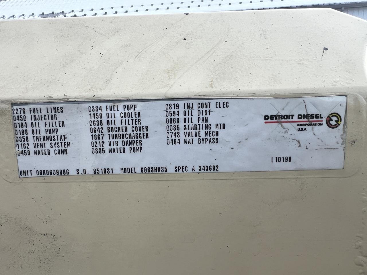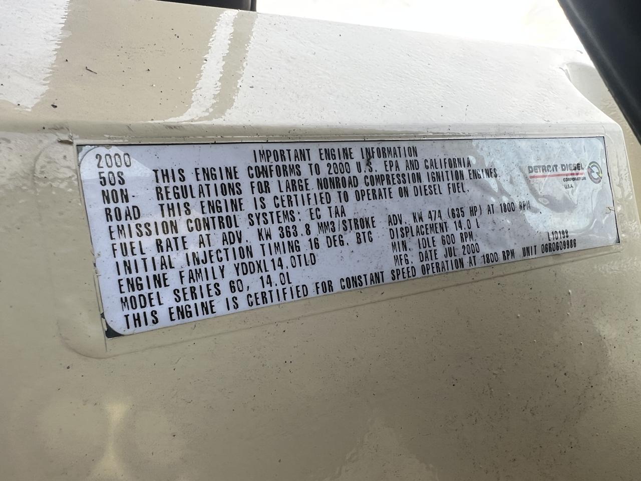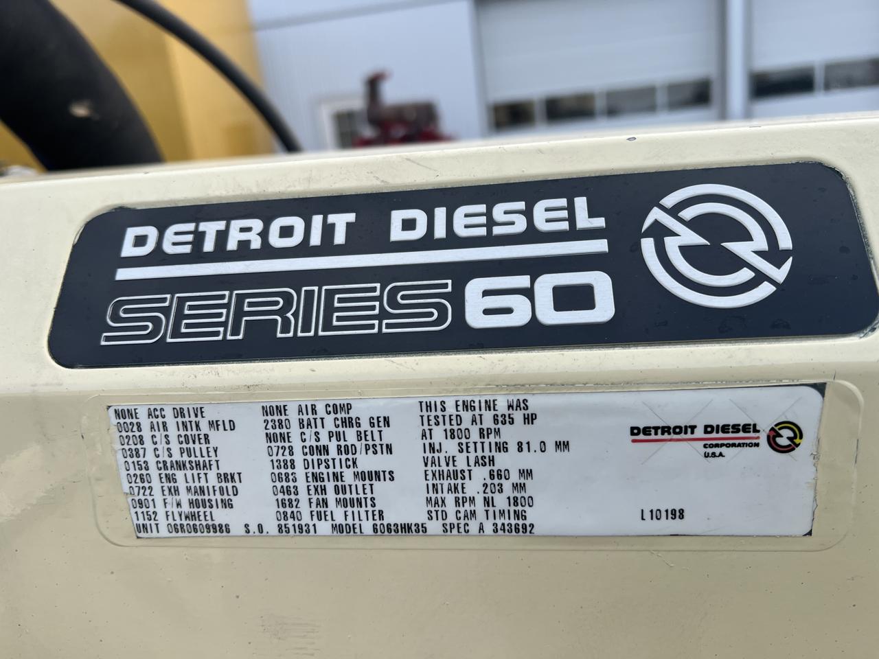 - Engine Description400 kW Kohler Generator, 14 Liter Series 60 Detroit Diesel Engine, Year 2000, 1186 Hours