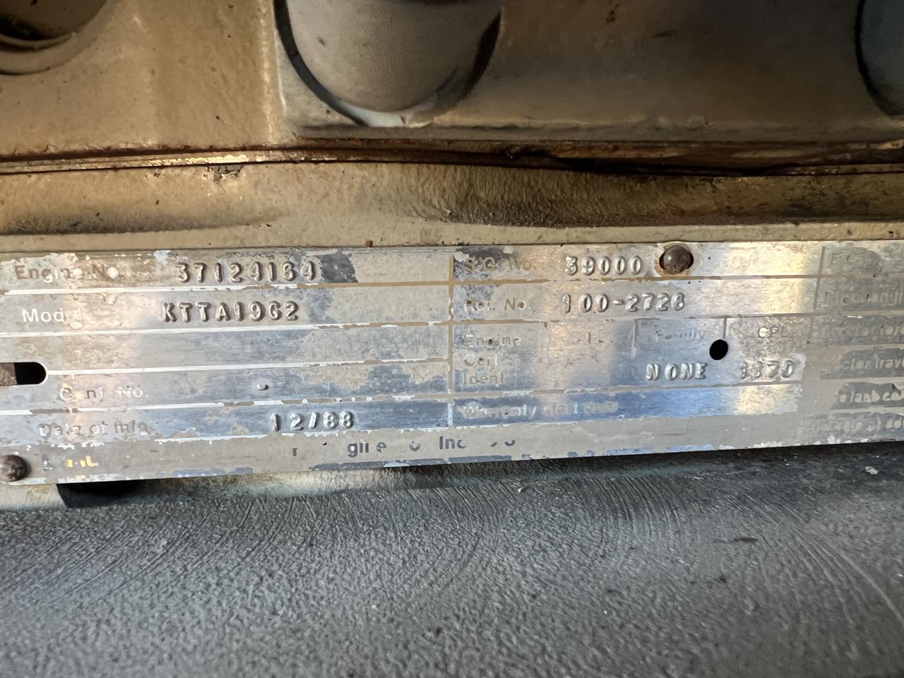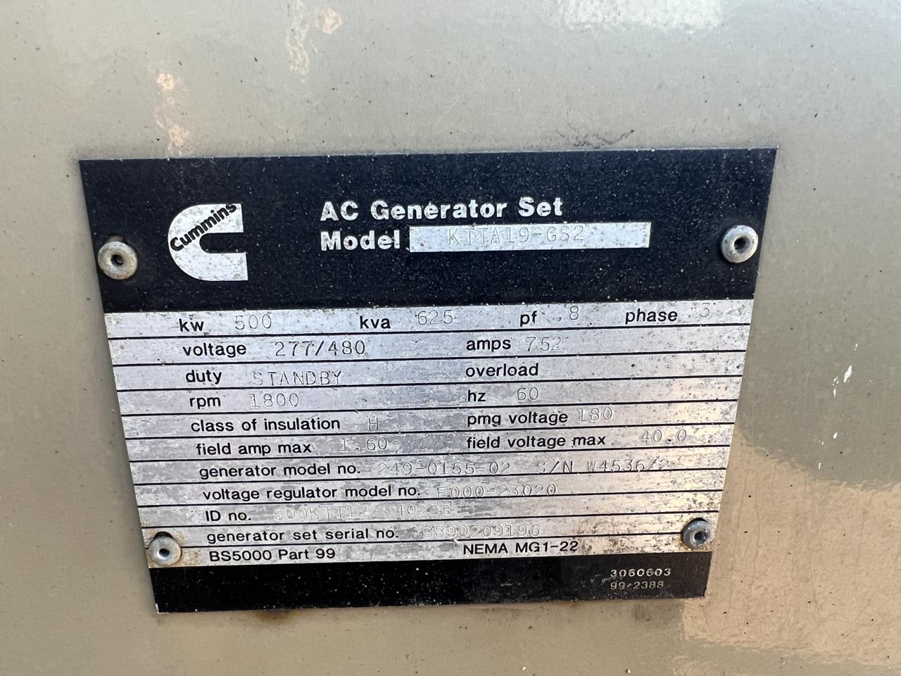 - Engine Description500 kW Cummins KTTA19-G2 Generator, with Enclosure, 19 Liter Cummins Engine, Year - 1988, 176 Hours