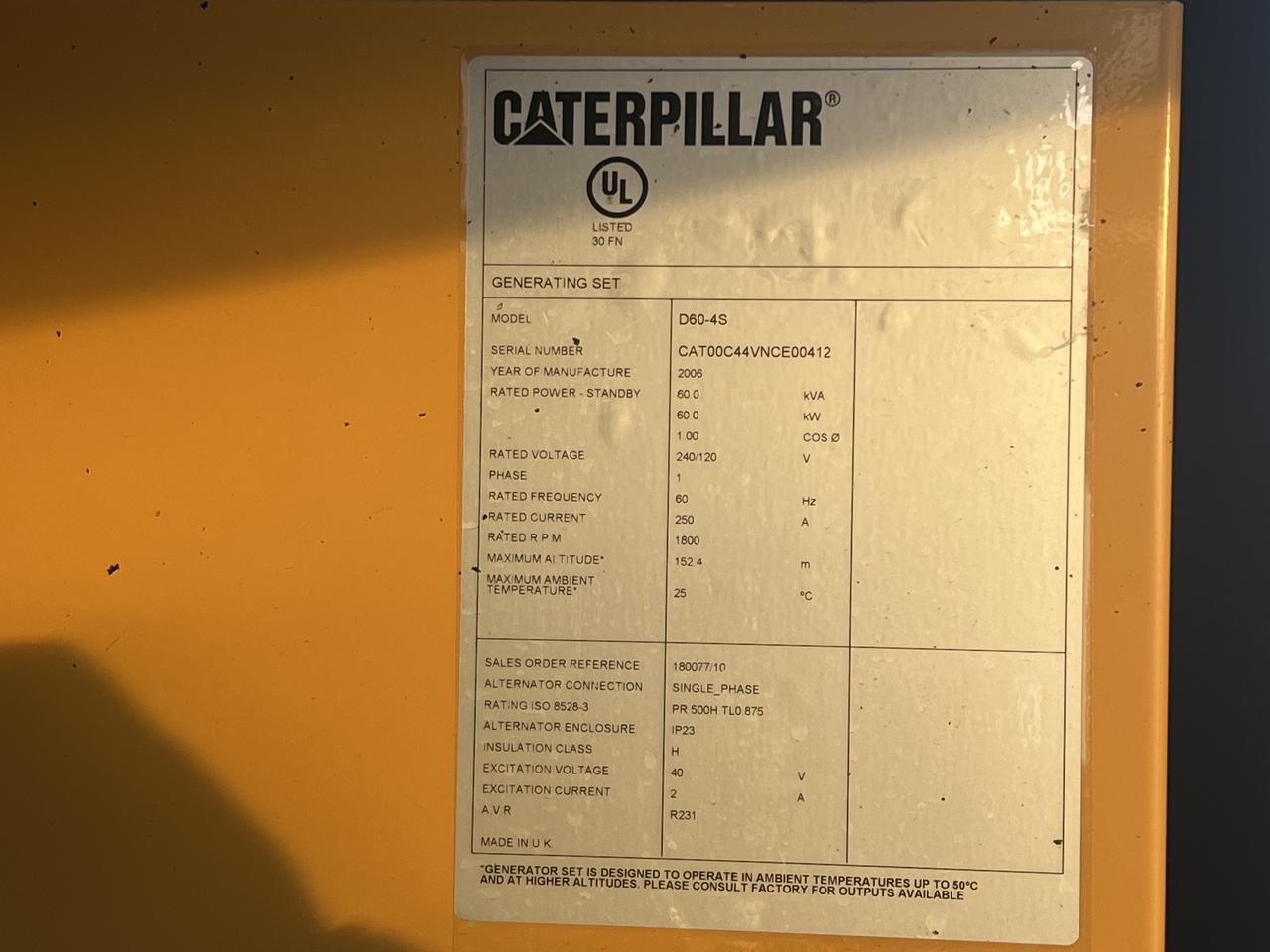 - Engine Description60 kW CAT Genset, C4.4 CAT Engine, Enclosed, with Base Fuel Tank, Year - 2006, 411 Hours
