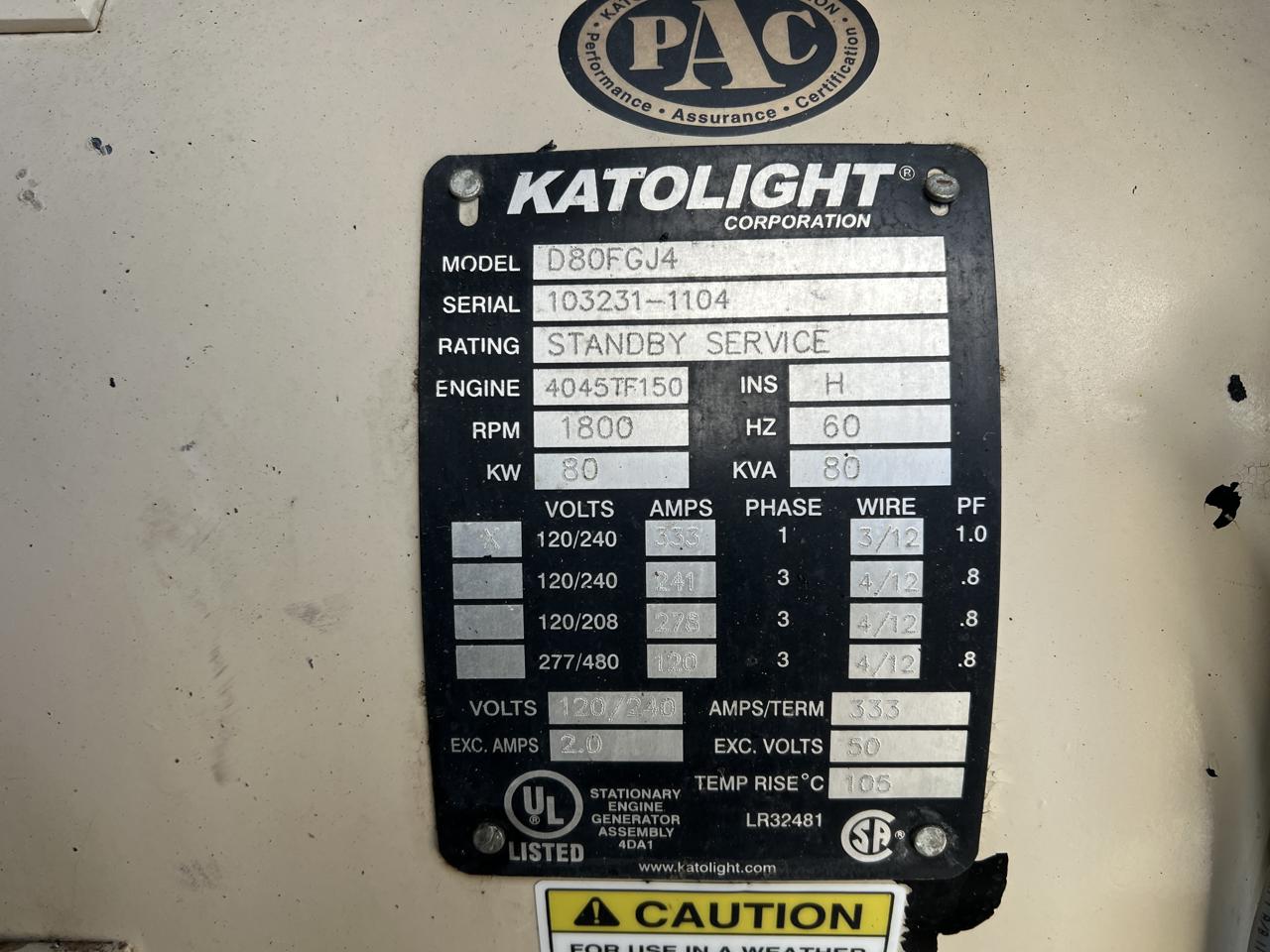 - Engine Description80 kW Katolight Generator, with Sound Enclosure and Base Tank, 4.5 Liter John Deere Engine, 134 Hours