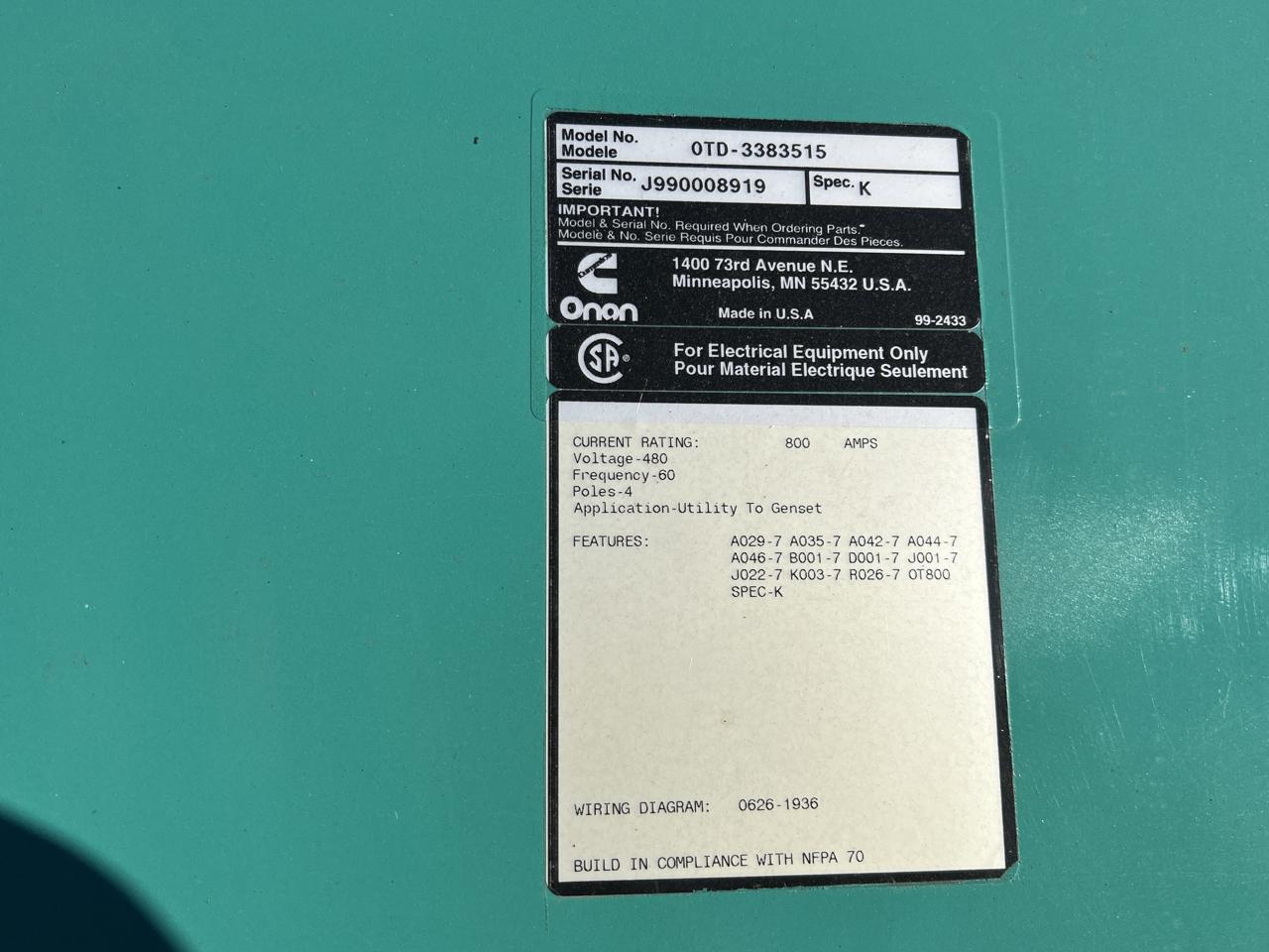Onan/Cummins Automatic Transfer Switch, 800 A, Nema 1 Enclosure